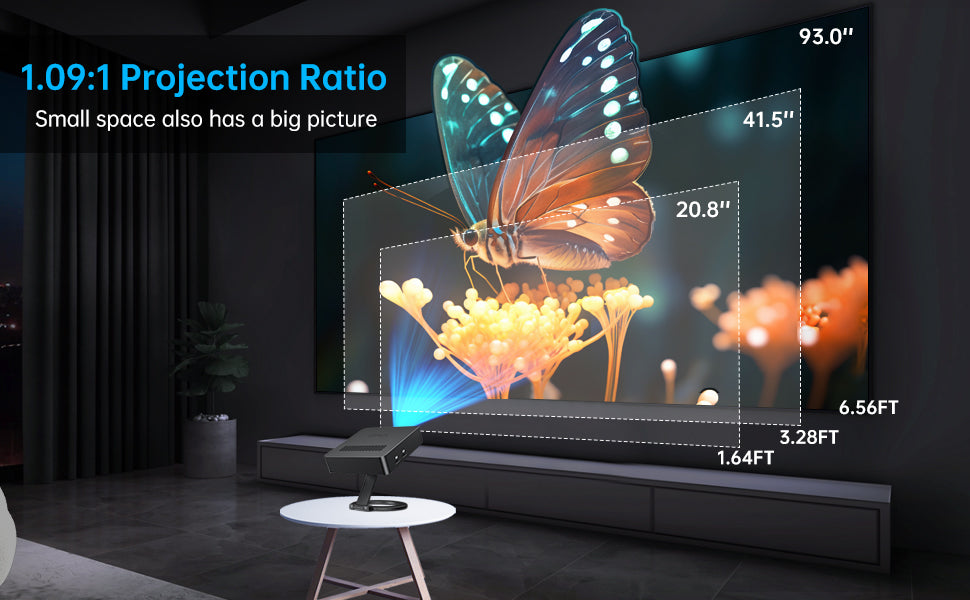 Don't let limited space stop your big-screen dreams! The Unihertz Mini Projector features an efficient 1.09:1 Projection Ratio, meaning you can cast a large, immersive image even when placing the projector close to the wall.